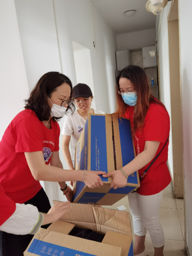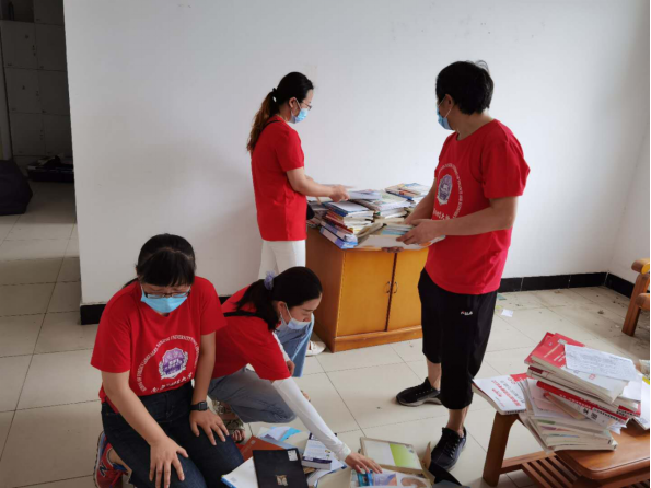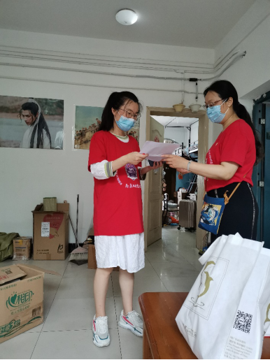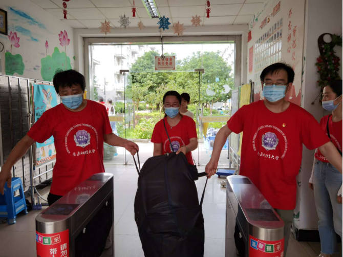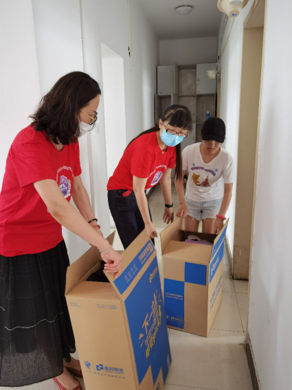 国际合作与交流处党支部书记姚杰、孙弛老师,肉视频 教工第二党支部书记周标老师,郑洪举老师,民主党派程水英老师,青年教师洪忠婷来到肉视频 女生宿舍,帮助学生打包和运送行李。