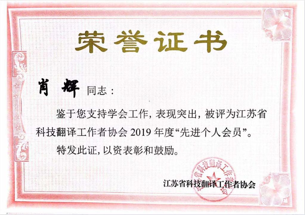 肖辉教授荣获江苏省科技翻译工作者协会2019年度“先进个人会员”称号。