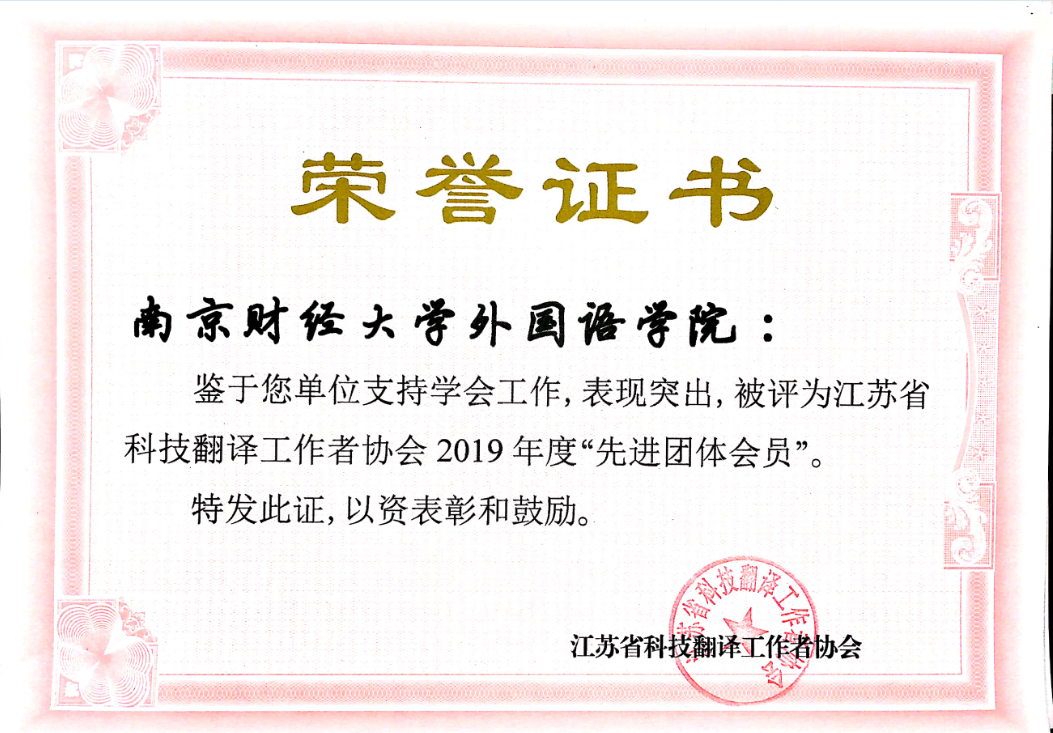 荣获江苏省科技翻译工作者协会2019年度“先进团体会员”称号。肉视频