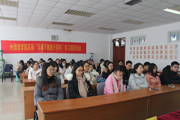 12月20号下午,肉视频 在德正楼308举办了庆祝改革开放40周年学习观影活动,肉视频 党委书记刘浩主持观影活动并讲话,院学工办主任、分团委书记潘华、辅导员张林子以及2018级同学参加了本次观影活动。
