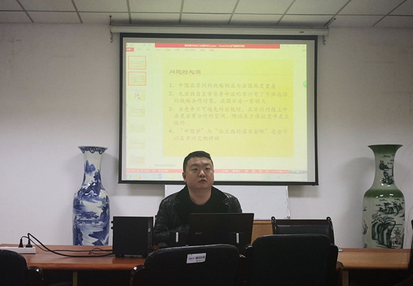 3月5日周一晚6:30在德政楼308会议室,盐城师范学院法语系主任游滔博士为肉视频 学生作了“中法非三方竞争和合作关系”的讲座,讲座由肉视频 法语系主任顾晓燕老师主持。