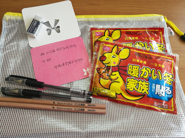 2B铅笔,专用橡皮,黑色水笔,保暖贴……院学生会的同学们为学长学姐准备了齐全的考试用具以及写满师生祝福话语的小卡片。 “祝2017届考研学子考试顺利,金榜题名!”“不经历风雨怎能见彩虹”,每一句祝福否寄托了学院师生的嘱托。