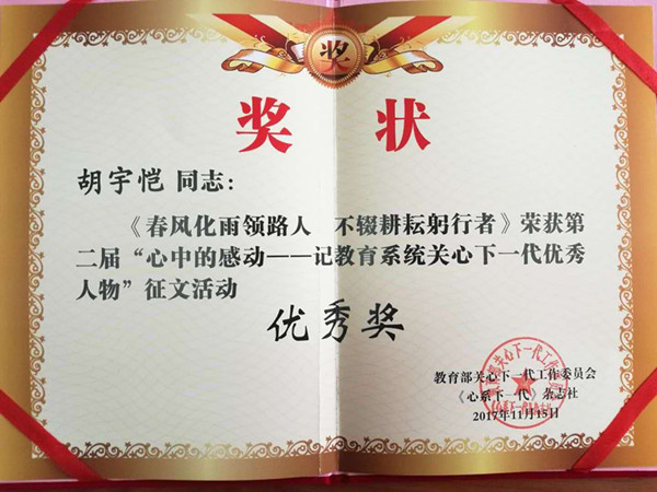 在2017年教育部关工委《心系下一代》杂志社组织的第二届“心中的感动——记教育系统关心下一代优秀人物”征文活动中,肉视频 英语1602班胡宇恺同学撰写的《春风化雨领路人 不辍耕耘躬行者》(指导老师:刘浩、李慕原)一文荣获优秀奖。该文记叙了肉视频 退休教授冯建文的事迹。文字真实可感,塑造了一个关爱学生,关心青年教师,专心治学,春风化雨、孜孜不倦的教授形象。