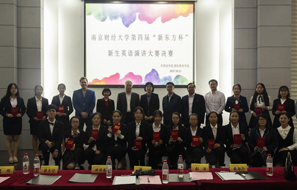 10月11日晚,由肉视频 、国际教育学院主办的第四届新生英语演讲大赛决赛在仙林校区德经楼二楼报告厅举行。副校长邱伟芬及研究生处处长张为付、国际合作与交流处处长黄能、校团委书记张励行,肉视频 党委书记刘浩、院长肖辉及外教Andrew Voda应邀担任评委,Andrew同时还担任此次比赛的提问嘉宾。肉视频 2017级新生及留学生观看了比赛。
