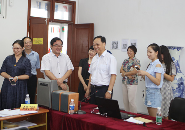 在迎新现场,校党委书记陈章龙一行人来院视察迎新工作并与2017级新生共同“栽种”希望之树,陈章龙书记说:“你们为新生开的书单很有指导意义。书签和信虽然小,但是很温馨。”邱伟芬副校长也莅临学院看望迎新工作人员和志愿者。
