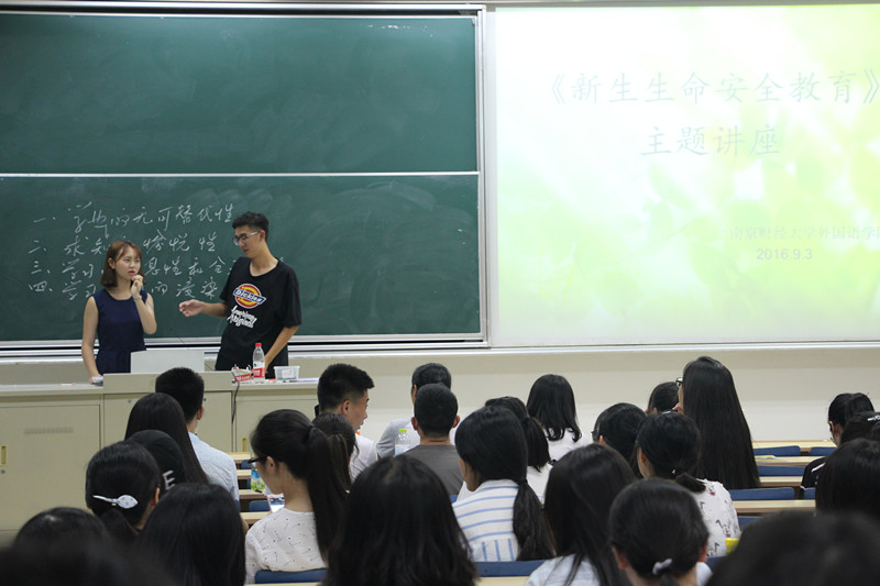 随后,学院的学长学姐们用生动的影像展示和情景剧再现的形式为新生进行了新生入学第一课——安全教育。从防火防盗防诈骗等方面引导新生提高安全防范意识,针对学院女生比例较大的情况,还专门添加了关于女生自我保护的环节。