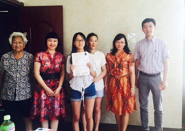 7月31日,我校肉视频 院长肖辉、党委副书记李慕原、校招生办主任衣琳一行充当起邮差,来到南通通州区五甲镇为肉视频 2016级新生曹苏南同学送去了录取通知书。