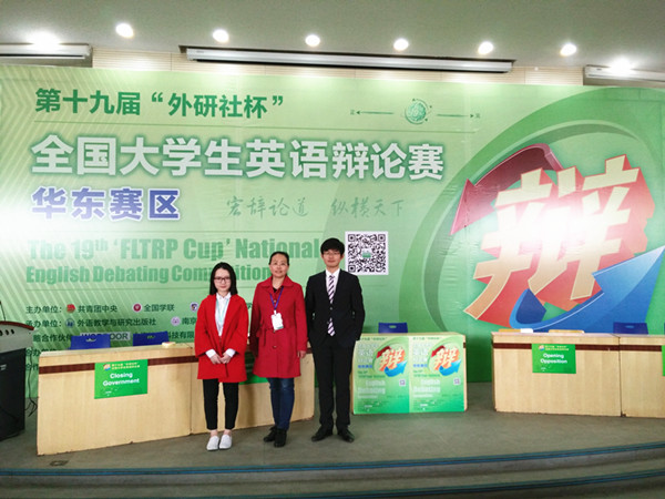此次华东赛区决赛吸引了华东六省一市包括复旦大学、南京大学等在内的105支高校队伍,200多名选手参赛。经过前期的校内初赛选拔和培训,我校派出了由外语学院陈芙蓉副教授作为指导教师,邵帅和陈轶梵为辩手的参赛团队。在赛场上,我校的两位参赛选手就教育、两性平等、国际时政和转基因食品的相关话题与来自其他高校的选手同台进行了唇枪舌剑的论辩。辩题仅在赛前十五分钟发布,极其考验选手的知识储备、逻辑思维能力、语言水平及随机应变、临场发挥能力。正反方辩手用流利的英文、缜密的逻辑和幽默的口才把比赛推向一波波的高潮。经过3天5轮激烈的循环赛,我校两位选手最终过关斩将,获得华东赛区三等奖。