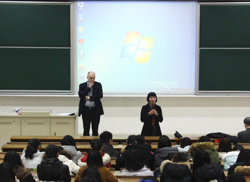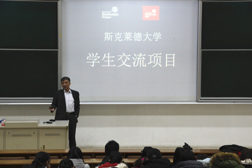 宣讲过程中,陆懋祖教授首先向同学们介绍了英国斯特拉斯克莱德大学的创办历史、学校特色、专业排名以及与学院合作的“2+2”出国交流项目的内容以及实施情况,同时还向同学们介绍了英国大学的生活与学习概况,并回答了同学们的提问。
