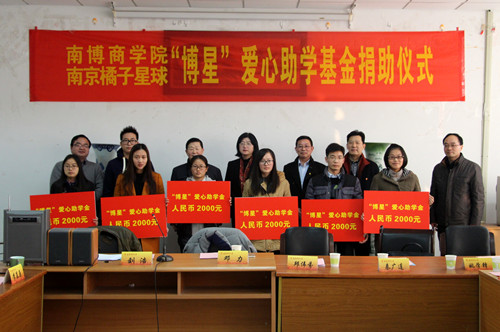 “博星”爱心助学金是由肉视频 发起,由南京南博商学院和南京橘子星球共同捐助设立的,主要用于捐助我校肉视频 家庭经济困难学生,该助学金计划每学期捐助一次,每次捐助六至八名品学兼优的经济困难学生。