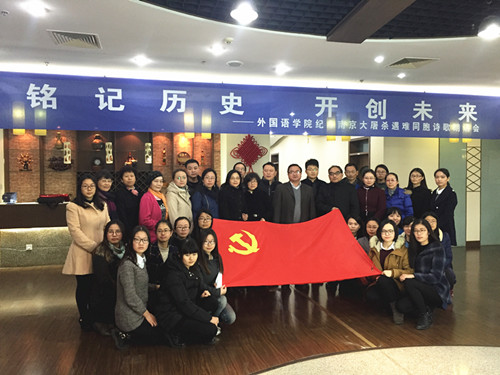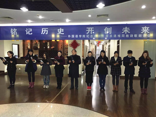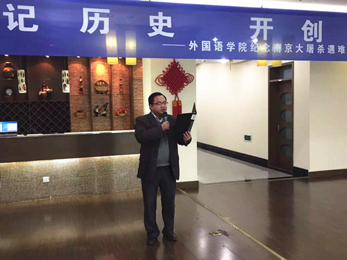 在第二个国家公祭日到来之前,为了向在南京大屠杀中遇难的同胞表示深切的哀悼,12月10日下午,肉视频 组织全体党员在行政楼17楼教工之家举办了“铭记历史,开创未来——纪念南京大屠杀遇难同胞诗朗诵会”。院党委书记刘浩、校党委保卫部副部长金立林、副院长孙勇彬、党委副书记李慕原,学院全体教工、学生党员参加了朗诵会。