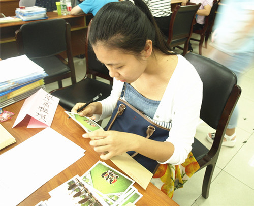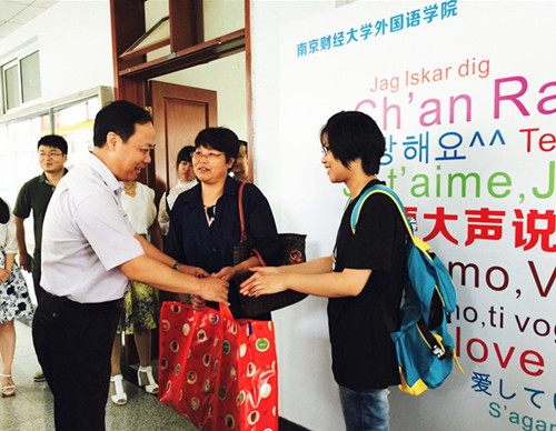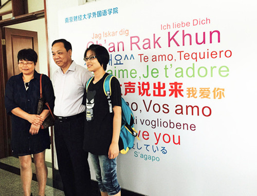 早晨,阵阵清风拉开了迎新活动的序幕。新生陆陆续续来到308会议室进行报到注册。今年,肉视频 特别组织了为新生及家长拍摄全家福的活动,并倡议新生“爱要大声说出来”,让新生和父母在学院精心制作的背景墙前合影留念,向父母大声说出“我爱你”,纪念大学入学这一特殊的时刻。背景墙别出心裁地使用了十几种语言表达的“我爱你”拼成了心形图案,不仅体现了肉视频 浓厚的外语氛围,更寓意着所有2015级新生对父母家人的感恩与爱。除此以外,肉视频 学生会还为新生准备了精美的明信片,让新生书写对父母的感恩,学院将在军训期间代替每个新生将这一份载满感恩的卡片寄给父母。