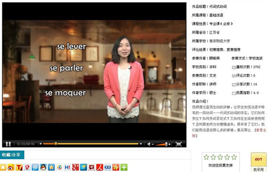 日前,由江苏省教育厅组织开展的2015年全省高校第二届微课教学比赛(本科组)评选结果揭晓,肉视频 法语系副主任顾晓燕老师的微课作品获得一等奖。