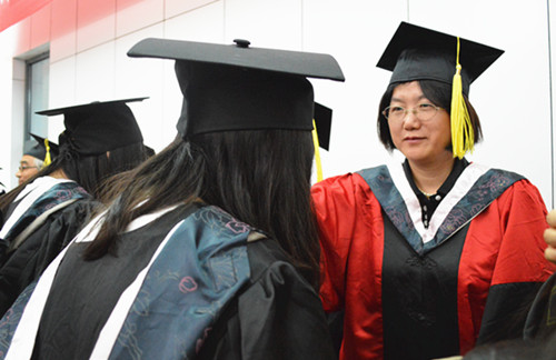 分管教学副院长邵怡宣读《关于授予2015届毕业生学士学位的决定》后,毕业生们身穿学士服,走上台前,学院领导和老师们为他们一一拨过学位帽上的流苏,授予学士学位证书。