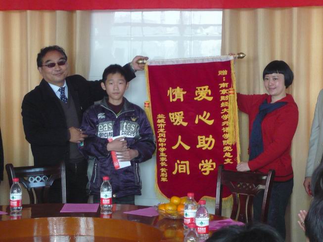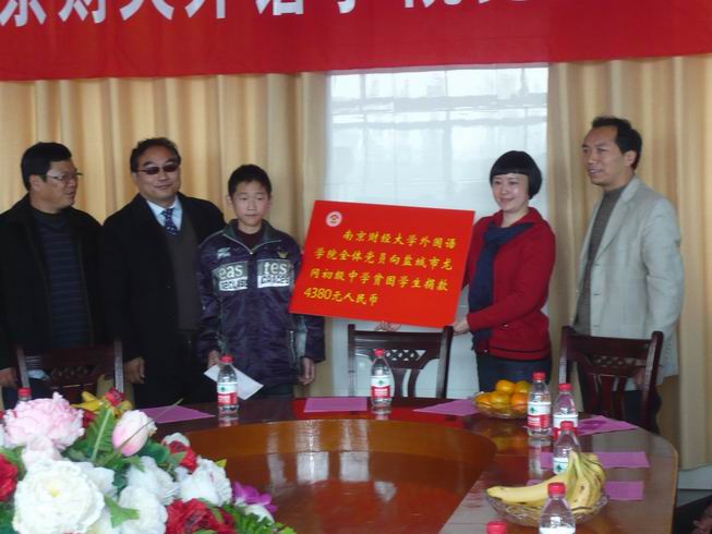 随后,党员们来到了盐城市龙冈初级中学开展奉献爱心活动。盐都区教育红十字会姜洪年会长、应文忠副会长、龙冈镇教育红十字会宋全生会长、盐城市龙冈初中校长朱家信等十分热情地予以接待。捐赠仪式由盐都区龙冈镇教育工作负责人宋仓生主持。参加此次捐赠活动的有肉视频 全体党政领导和教师党员。首先肉视频 党总支书记肖辉教授代表肉视频 全体师生党员热情接待、精心安排和为肉视频 在“争先创优,奉献爱心”活动中搭建这么好的平台的龙冈中学表示了衷心的感谢,并就此次活动的形成和意义做了讲话,同时衷心希望接受捐赠的黄鑫同学好好学习、天天向上、早日成为国家的栋梁。随后龙冈镇教育局副局长姜洪年也代表龙冈镇教育局对我们的这次捐赠活动的重要意义表示充分肯定,并对肉视频 的到来表示了热烈的欢迎。院长王克明教授也对龙冈中学的热情接待表示了衷心感谢。隆重的捐赠仪式正式开始。肉视频 向黄鑫同学当场捐赠了全体师生党员捐款4380元及图书40余册。与此同时也肉视频 接受了盐城市龙冈初中学生家长黄利军赠给肉视频 的“爱心助学、情暖人间”的锦旗。黄鑫同学虽遭遇家庭不幸,父亲瘫痪在床,母亲下岗,但仍自强不息,勤奋学习,成绩优异,肉视频 党总支将全体师生党员捐款及图书当场捐给他,勉励他克服困难,积极奋进,以优异的成绩回报党和人民。接着,肉视频 党员教师结合自身的专业特点和龙冈中学部分同学开展了英语交流活动,在热烈轻松的氛围中,师生共同探讨英语学习的经验与技巧,激发了学生学习英语的兴趣,增强了他们的口语交际能力。最后党员们还在龙冈镇中合影留念。
