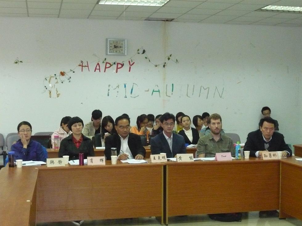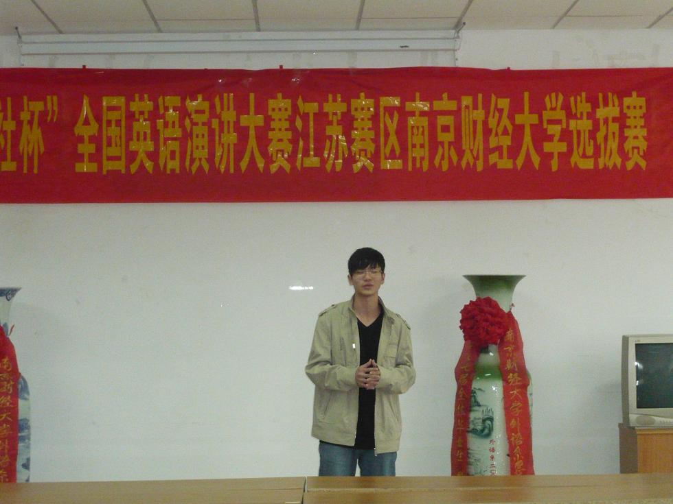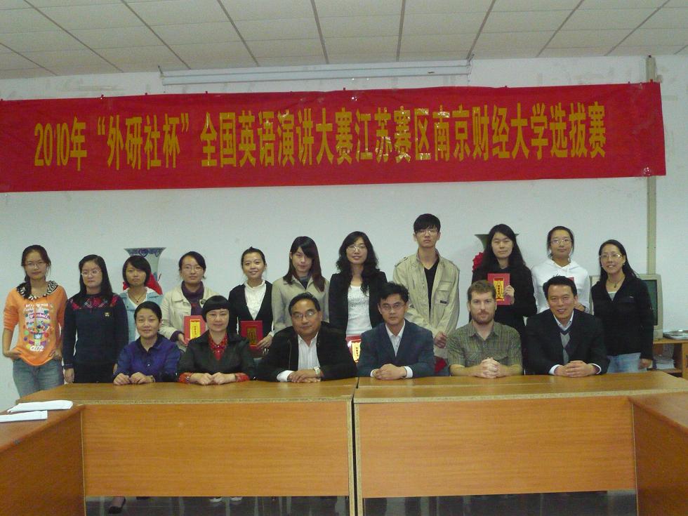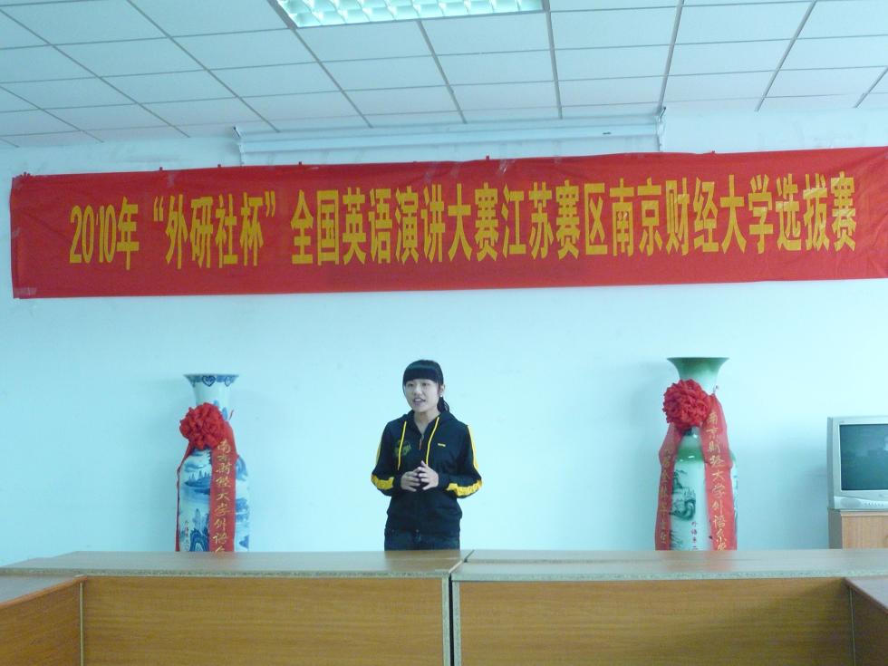 2010年10月13日14:00,2010年“外研社杯”全国英语演讲大赛江苏赛区肉视频 选拔赛在专三308拉开帷幕。42位参赛选手带来了他们自选主题的精彩演讲。此次选拔赛有评委老师有院长王克明教授、党总支书记肖辉教授、国际合作与交流处黄能副处长,副院长孙勇彬教授、外教Devek和韩静老师。
