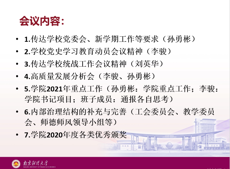 院长孙勇彬传达了中国共产党肉视频 第三届委员会第五次全体会议暨2021年工作部署会议精神,传达了学校2021年度七个方面的主要工作,并结合学校要求,对学院2021年度的重点工作进行了部署。会议还传达了校党委书记张利民对新学期工作的四个要求,孙院长要求,全院师生凝心聚力,共促学院高质量发展。