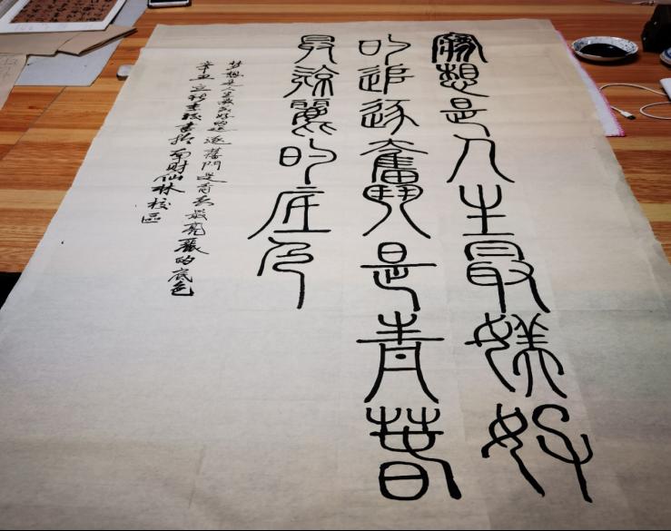 师生们纷纷拿出了“看家本领”,以饱满的热情创作出一幅幅充满革命豪情的书法作品,作品落笔收笔张弛有度,真、草、隶、篆、行等风格迥异、各具特色,真切地表达了对红色岁月的缅怀和追思。学院党委书记李骏也挥毫泼墨,借助书法这一中华优秀传统文化的表现形式,尽情抒发对祖国的热爱、对先烈的缅怀和对青年的期望和寄语之情。法语1801班李航峰同学以“勿忘国耻、圆梦中华”的书法作品来表达对烈士的敬仰,他表示:“书法讲究要有‘劲’儿、有力道,还要能持久地去练习,写出的作品才会力透纸背,笔墨精妙,同样也正是因为有了百年大党,给予我们安全感和归属感,青年人才更有‘劲’儿。作为当代大学生,我们不能忘记历史,不能忘记中华民族经历的苦难,请党放心,强国有我,我要以奥运健儿们赛场拼搏的那股‘劲’儿为榜样,不负韶华、学好本领,为祖国的发展贡献自己的青春力量!”