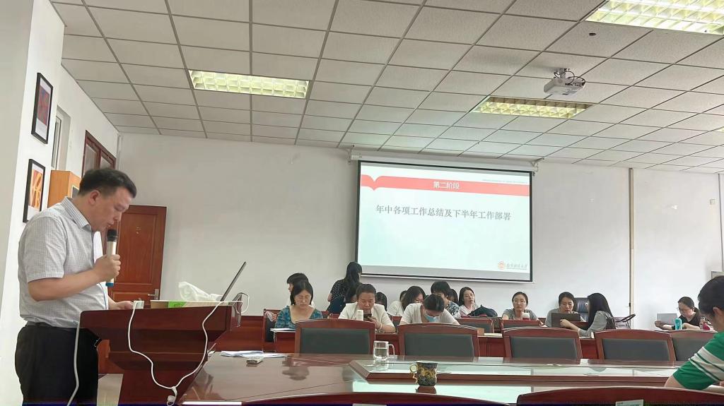 会议伊始,孙勇彬院长传达了学校近期各项会议精神,带领大家学习了习近平总书记关于粮食安全的重要论述、习近平总书记给南京大学留学归国青年学者的回信精神以及全国宗教工作会议精神。他表示:年初定目标,年中看进度,年底亮成果,上半年,在全院老师的辛苦努力下,学院顺利完成了全校大学英语以及各门专业课的线上以及线下教学,学院在党建工作、教学、科研、人才引进、学生工作、社会服务等方面取得了不错的成绩,学院将紧盯年初目标,努力赶超进度,充分利用暑假的时间,争取年底亮出成果。