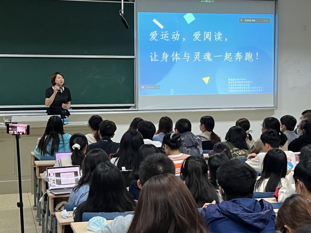 讲座中,葛见珠馆长以《爱运动,爱阅读,让身体与灵魂一起奔跑》为主题,回顾了自己自2017年立下打卡图书馆志愿以来走过的图书馆、读过的书、遇见的人、以及所获所感。葛见珠老师用“一生二、二生三、三生万物”总结书店打卡的收获,用“书——书店——讲座——书友——作家——文化名人——读书组织——人生好友”这一连锁反应来概括阅读带来的人生遇见的奇妙模式。葛老师认为“有书就有力量”,她从“阅读对家人的影响”、“对学生的影响”、“对未知的影响”、“对工作的影响”等几个方面深度阐释了阅读这一“精神操练”为人生带来的益处。讲座最后,葛老师还亲身示范,教会大家用健康向上、积极优美的站姿迎风面对扑面而来的大学生活。