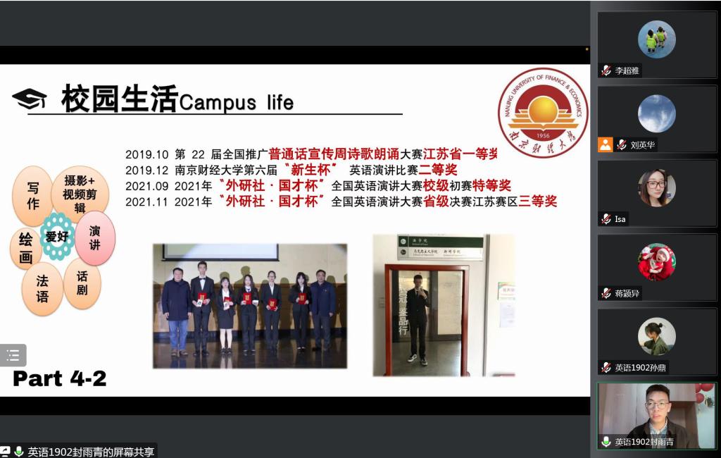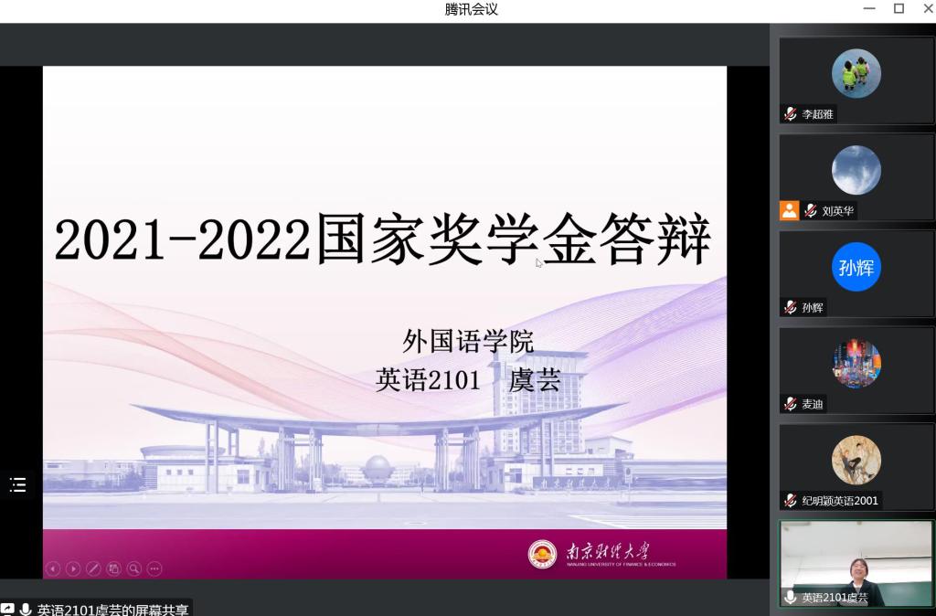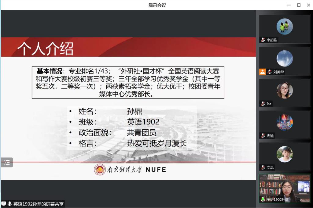 经过前期个人申报和学院初审,来自肉视频 2019、2020、2021级共计4名候选人进入最终的评审环节,按照抽签顺序依次进行答辩。几位候选人分别从思想政治、学业成绩、学科竞赛、社会实践等方面取得的成果进行全方位、多角度的展示。英语1902班孙鼎同学自信、从容、大方,以扎实的专业学习成绩和较强的实践能力给大家留下了深刻印象。