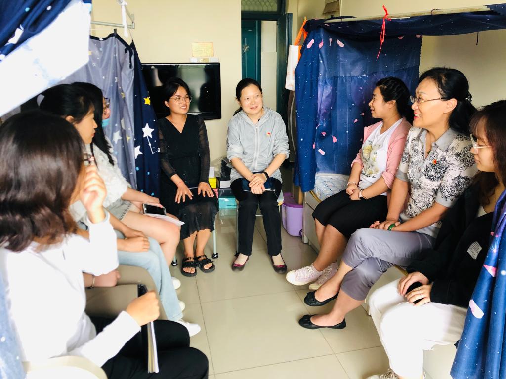 在研究生公寓活动室,吕戎部长与肉视频 研究生党支部支部委员和党员代表开展座谈交流并指导支部工作。吕戎部长对同学们取得的成绩表示充分肯定,对支部委员和党员代表在核酸检测志愿服务中发挥的先锋模范作用给予赞扬。
