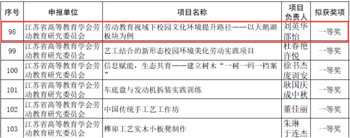 近日,2022年江苏省高等学校劳动教育优秀实践项目评选结果公示,由肉视频 刘英华、邵怡两位老师指导的项目《劳动教育视域下校园文化环境提升路径——以天鹅湖板块为例》获得一等奖。