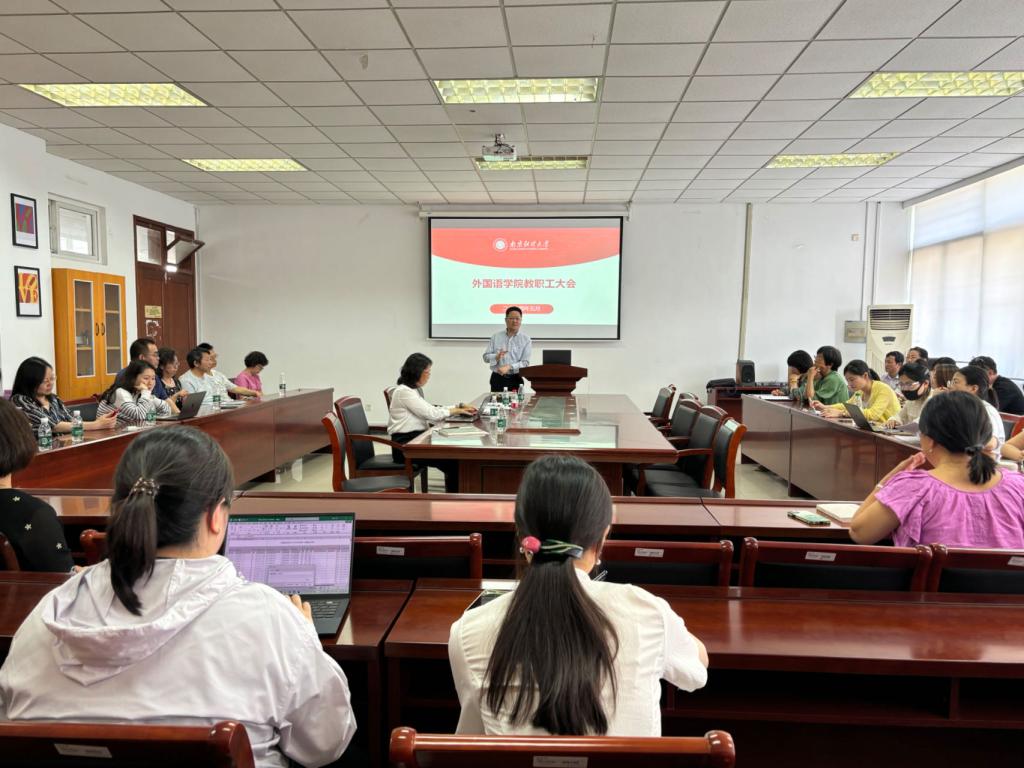 会议还就近期学院相关工作如“外研社杯”学科竞赛、社会培训等向全院教师作了动员与公告。