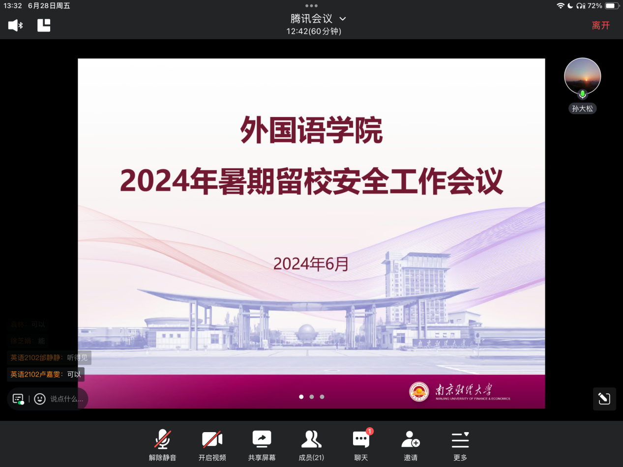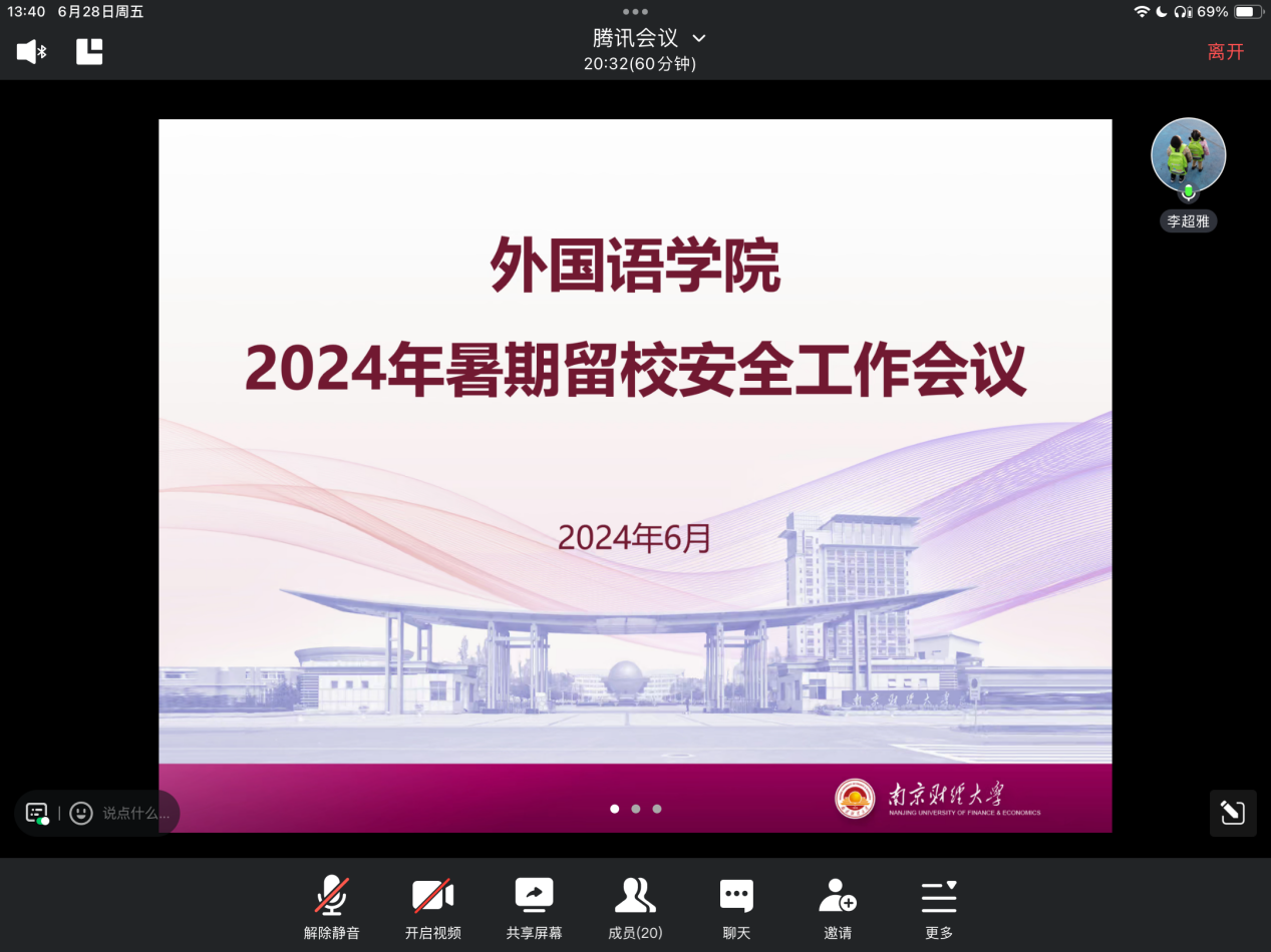 加强学生暑期安全教育,筑牢安全防线,引导学生做好暑期学习生活规划,肉视频 6月28日召开2024年暑假留校安全工作线上会议。肉视频 党委副书记孙大松、学工办主任李超雅、学院全体辅导员、暑期留校的本科生及研究生参加会议。本次会议由党委副书记孙大松主持。