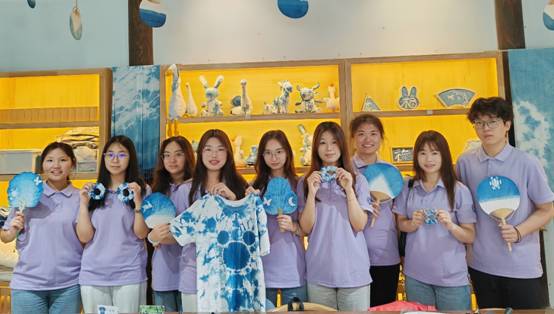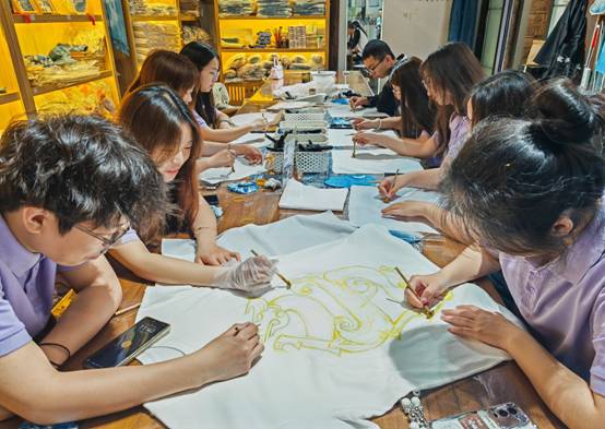 活动伊始,手工艺人向同学们介绍扎染的历史、艺术特征和应用范围、染液的成分、扎染的基本技法,“扎染工艺分为扎结和染色两部分,通过线、绳、皮筋等工具,对织物进行扎、缝、缚、缀、夹等多种形式组合后进行染色。”扎染手工艺人一边向学生讲解,一边分发笔、织物、染料等物品。为了给学生带来原汁原味的传统文化和手作体验,此次劳动教育实践活动在肉视频 优秀校友石贤的“从黔故事”民族文化生活馆中开展。白色的短袖、方巾、扇子和发圈是此次扎染和刺绣的材料,在学习了扎染的基本知识和具体步骤之后,各组同学自行构想出各自扎染主题并进行创作。在手工艺人的耐心指导下,同学们全身心投入到扎染制作中,大胆设计,细心琢磨,认真落笔,有的按照图样精准操作,有的则放手一搏,展现个性风采,巧妙地折叠、捆扎,在染缸中完成染色后,解开捆扎,呈现出层次分明、色彩斑斓的扎染艺术品。漆扇制作也吸引了众多学生的参与。同学们亲自体验调漆、滴漆、拨纹等步骤,在扇面上描绘春天,创作出绚丽多彩的漆扇作品。在动手实践中体验传统文化,更让他们坚定了文化自信,做中华优秀传统文化的忠实传承者。