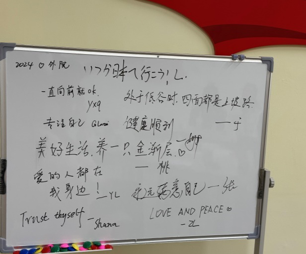 此外,班会还特别设置了“同学互夸”环节。在这个环节中,同学们用自己的语言轮流赞美和肯定自己邻座身边的同学。这一环节不仅增强了同学们的自信心和归属感,也进一步促进了彼此之间的了解和友谊。最后,大家在小黑板上写下对美好的寄语。此次心理班会在欢声笑语中圆满结束通过此次活动,同学们不仅享受了美食的快乐,更收获了心理健康的知识与力量。