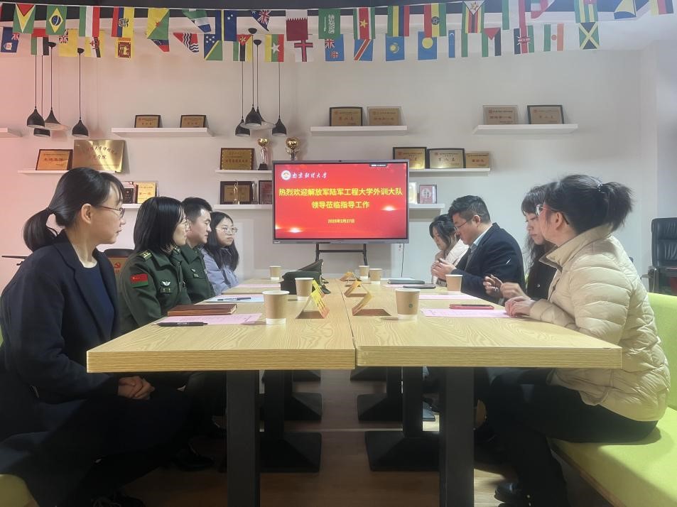 2月27日,解放军陆军工程大学外训大队翻译室副主任孟磊一行赴肉视频 进行调研交流。会议由肉视频 党委副书记孙大松主持。解放军陆军工程大学外训大队翻译室副主任孟磊、外训二队队长李俊枫、外训一队翻译丁萍萍,以及学院院长助理范晨、翻译专硕负责人杨艳、法语讲师冯镜元等参加了此次活动。