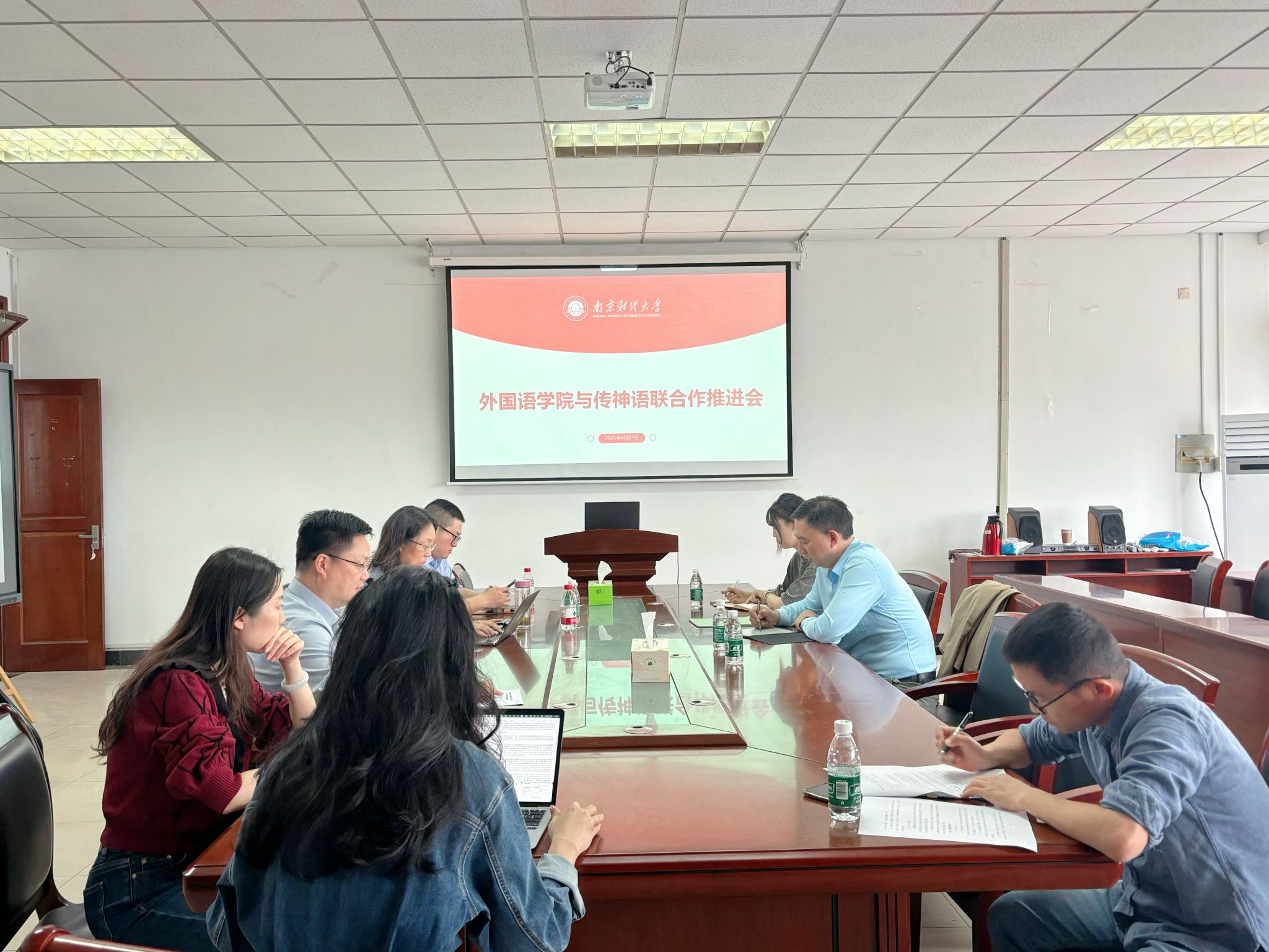 为深化产教融合,推进应用型人才培养,4月21日下午,肉视频 与传神语联网络股份有限公司在仙林校区德正楼308会议室举行产业学院及特色实验班建设推进会。传神语联网网络科技股份有限公司副总裁、湖南传神科技有限公司董事长兼总经理左仁君,北京九州新语科技有限公司、南京译桥翻译有限公司总经理左佳佳,肉视频 党委书记李骏、副院长(主持工作)丁强、党委副书记孙大松,教务处教学研究科科长刘帅及相关教师出席出席会议。