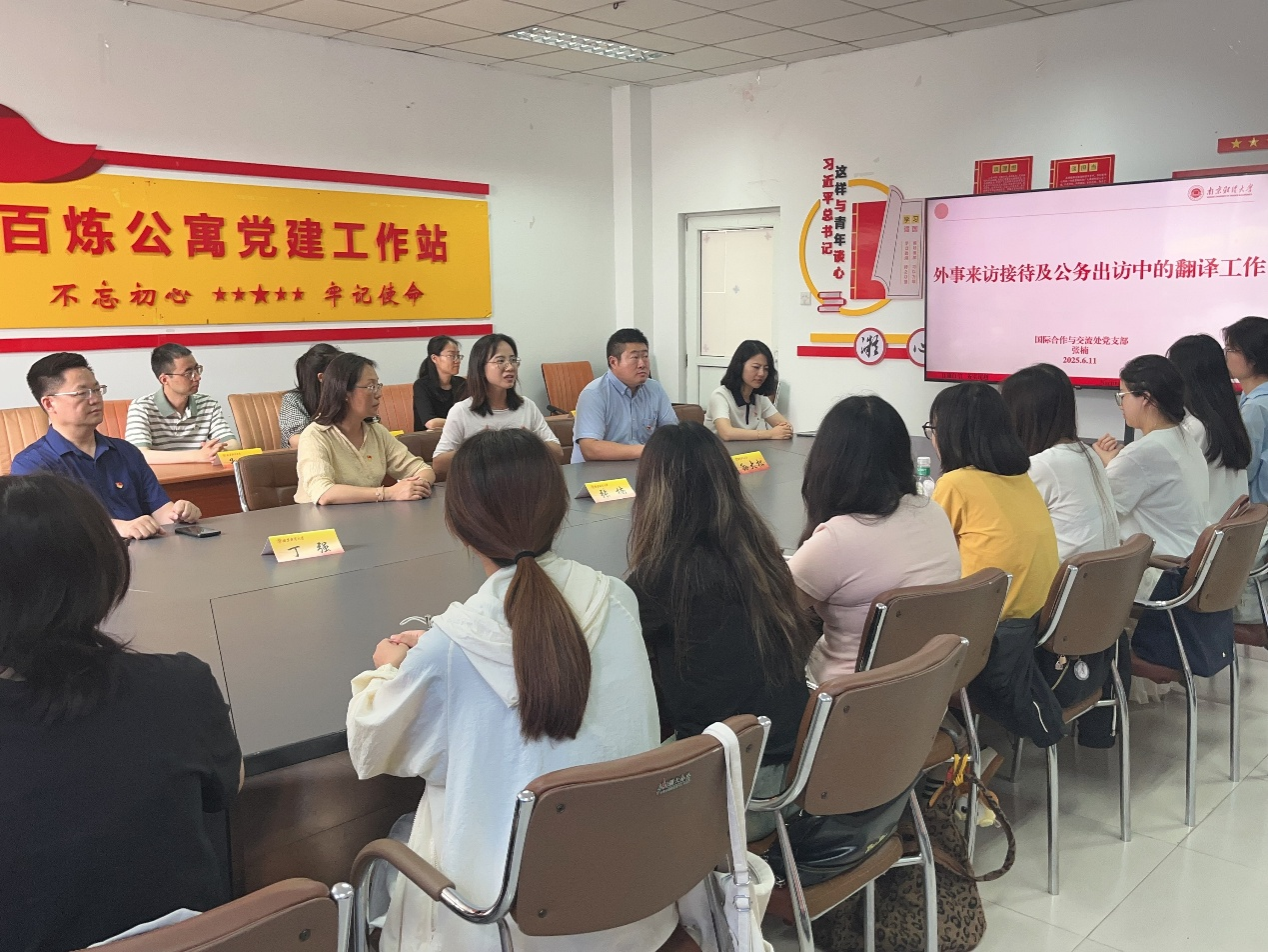 国际合作与交流处党支部书记张楠围绕外事翻译工作做经验分享。她结合实际工作案例,介绍了学校外事翻译的特点,让同学们了解到每一场翻译背后都有着译员的精心准备、反复推敲和深思熟虑。活动中,她还以场景再现、现场对话等方式分享了外语学习的经验,并重点向同学们提出了两点建议,一是淬炼专业能力,锻炼英语口语表达能力,用语言优势向世界讲好中国故事,传递好中国声音;二是塑造核心价值,做好外事翻译工作既是服务他人、服务社会,也是在沉淀自己、认识自身,要在这个过程中锻造自身的实践创新力、自主学习力和国际胜任力。
