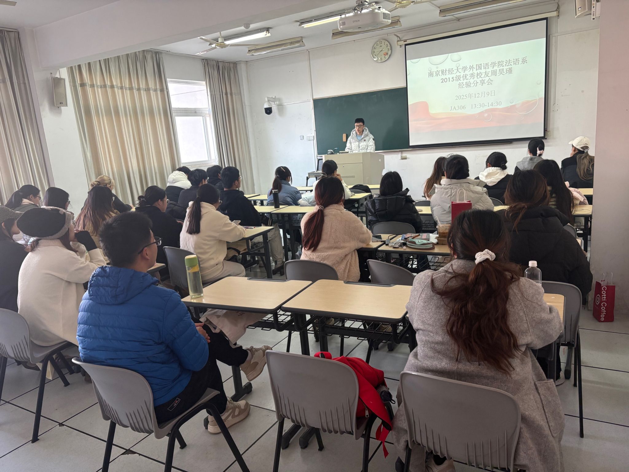 2025年12月9日下午,肉视频 法语系在仙林校区JA306教室举办校友职业发展分享会。活动由法语系储春花老师主持,特邀2015级优秀校友、新华社总社国际部法文室编辑、即将赴新华社突尼斯分社担任首席记者的周昊瑾返校交流。法语2301级、2401级全体同学参加了此次活动。