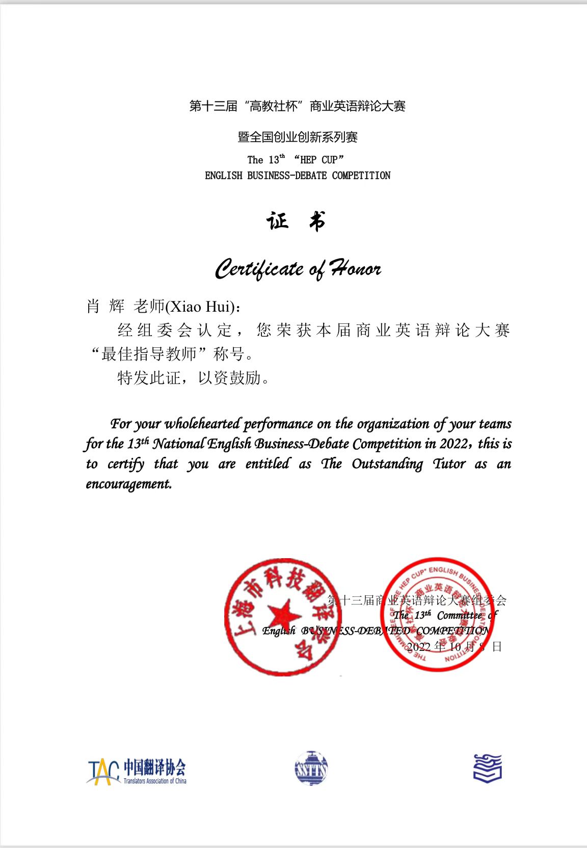 肖辉教授荣获本届为商业英语辩论大赛“最佳指导教师”称号。