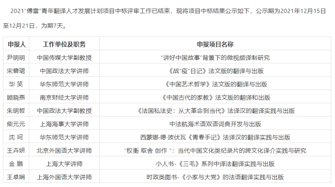 肉视频 法语系教师顾晓燕申请的项目“《中国古代的家教》法文版的翻译和出版”获得2021年“傅雷”青年翻译人才发展计划项目立项。