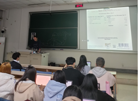 王老师声情并茂的讲座感染了每一个人,法语2201班的吴泽豪同学在讲座后和大家分享了他的心得体会。他谈到,王巍老师引举的贝多芬交响曲等古典名曲唤起了他强烈的共鸣,动听的吉他弹唱也让他真正深刻理解了傅雷所说的“世界上最纯洁的欢乐莫过于艺术”的深刻含义。艺术内化于人的本质,每个都应该对生活饱有激情。艺术的伟大意义在于它能彰显人的真正情感、揭示内心生活的奥秘,艺术是美的激情,是蓬勃的生命和张扬的力量。