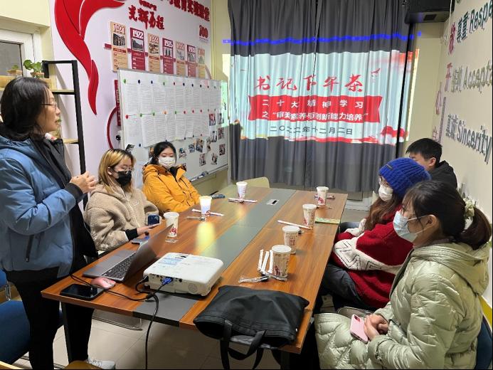 李骏书记以“审美素养与创新能力培养”为题带领学生代表们进行党的二十大精神的学习。她从党的二十大报告中关于“创新”的阐述与要求谈起,追溯“什么是创新”“什么是创新型人才”,从英语词源学视角探索了“创新”的内涵。继而,就“如何培养创新能力”这一问题,李骏书记从“艺术与创新能力”两者之间的关系谈起,以生动的案例、真实的调研数据,分析了艺术培养创新能力的原因与路径。她倡导同学们培养丰富的审美想象、激发独特的审美情感、形成正确的审美观点,以此不断练就自身的创新能力。