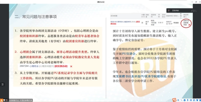 会议伊始,分团委副书记羊笛对“PU口袋校园APP”进行了简要的介绍,结合新生手册、明确学校对第二课堂学分的具体要求,并着重强调了PU平台对第二课堂活动管理的重要性。随后,羊笛对PU平台的基本操作展开培训,就活动发起、签到签退、活动完结、申诉流程等方面为大家详细构画了APP使用指南示意图,并陈列出以往工作过程中出现的常见问题及注意事项,帮助团支书熟悉活动的发布以及管理,为将来开展PU活动打下坚实的基础。会议过程中,各班团支书认真聆听并记录要点内容,与主讲人积极互动、深入沟通。此外,为避免后续工作中出现错误和疑惑,分团委组织部的负责人陈思彤同学和刘玺享同学在主讲结束后对接各班团支书,为有疑问的同学进行了一对一的解答。