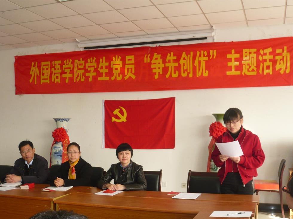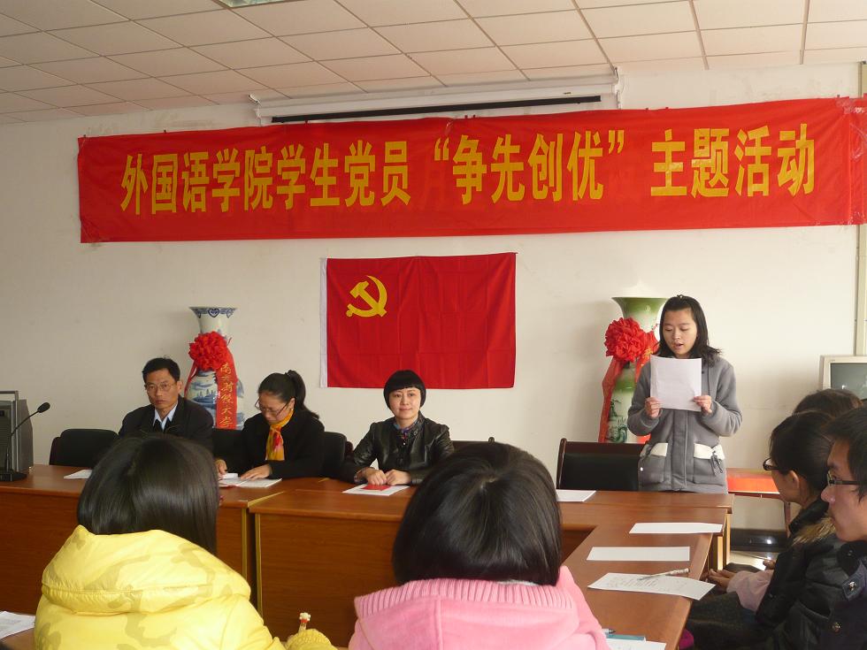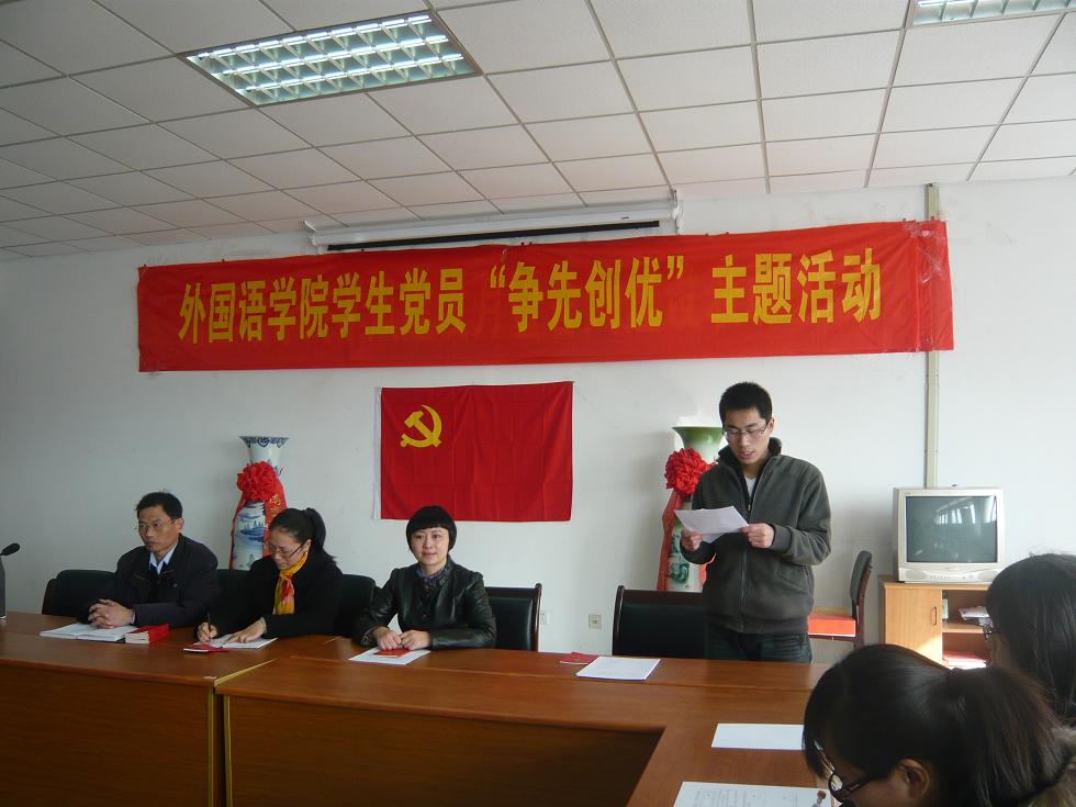 2010年12月9日下午,肉视频 在学院会议室举办了学生党员“创先争优”主题活动。参加此次大会的有肉视频 党总支书记肖辉教授、团总支书记金立林老师、辅导员孟德明老师、薛桂芳老师以及全体研究生党员及本科生党员。大会由团总支书记金立林老师主持。