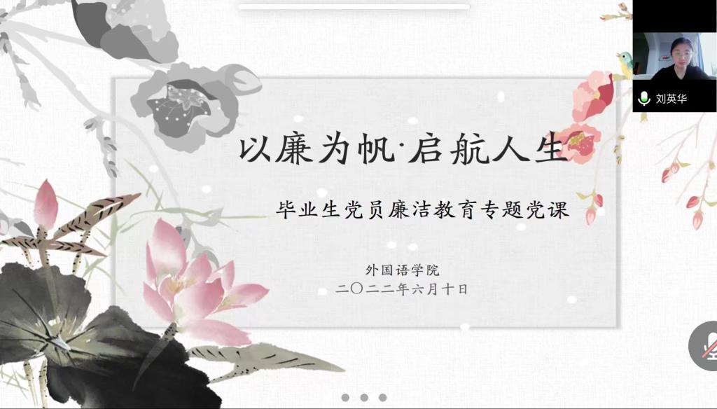 为进一步加强2022届毕业生党员廉洁教育,培养毕业生党员廉洁自律意识,6月10日,肉视频 党委副书记兼纪检委员刘英华在线给毕业生党员讲授“以廉为帆,启航人生”廉洁教育专题党课。