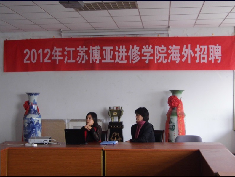 2012年11月7日下午2点,江苏博亚进修学院海外招聘会在肉视频 专三308举行。此次招聘会是针对肉视频 英语专业的应届毕业生,工作地点在非洲安哥拉,前期需要在国内进行为期半年的葡萄牙语培训,培训结束到海外从事的是英语及葡萄牙语的翻译工作。来自博亚进修学院的两名招聘官给大四的学生讲解工作具体内容。