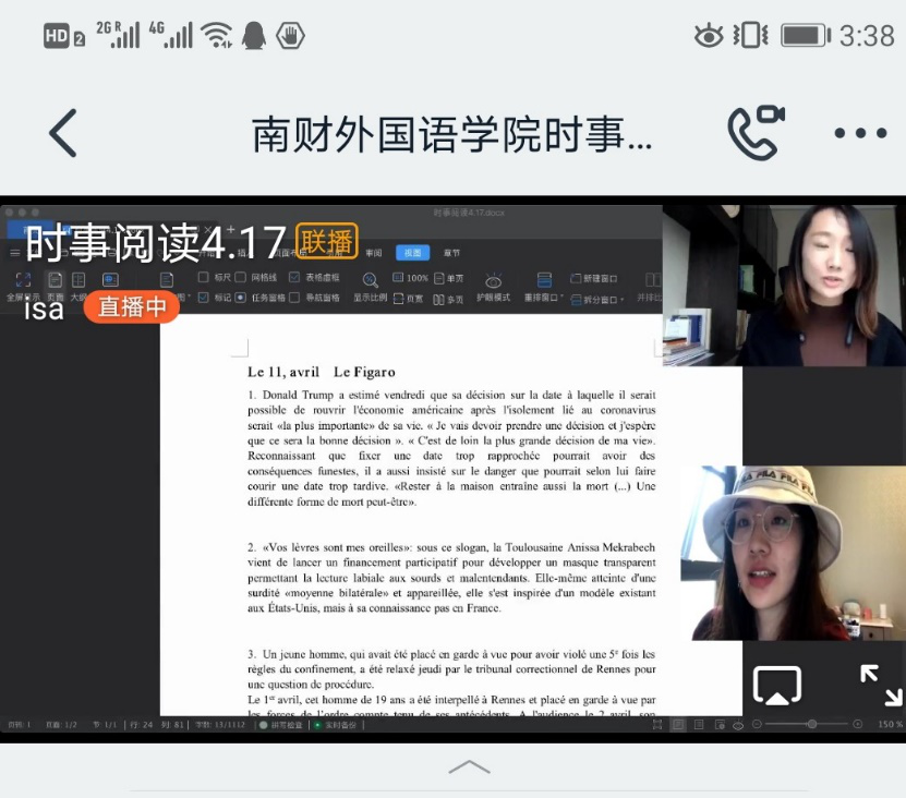 为了学生安全返校学习,老师们的在线课堂也好不松懈,早早地就做起了准备工作。凌燕老师在“法语时事阅读”中讲起了多种类型的“口罩”用法语如何表达,顺便普及了一下科学知识,同时还通过一篇国家元首演讲稿分析疫情期间解除隔离的利与弊,使大学生们对特殊时期的国家经济与社会发展有了新的认知;白天老师则给学生们阅读了4月6日英女王伊丽莎白的战疫演讲《美好的日子终将会回来的,我们将会重逢》,在和大学生们一起分享纯正英式英语的同时,也使同学们感受到了互相关爱、鼓励的美好……
