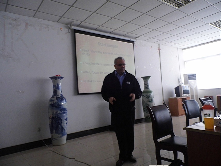 4月24日下午,肉视频 邀请我校部分外籍教师参与了肉视频 的教研活动。首先,外籍教师Daniel在院会议室做了一场题为Enjoy Teaching 的讲座,他幽默风趣的语言和丰富的肢体动作感染了在座的每一个老师。Daniel强调在课堂上要加强和学生的互动,鼓励学生在课堂多发表自己的见解;另外,他对如何提高课堂效率也发表了自己的见解,如可以先让学生在课前将手机交上来。