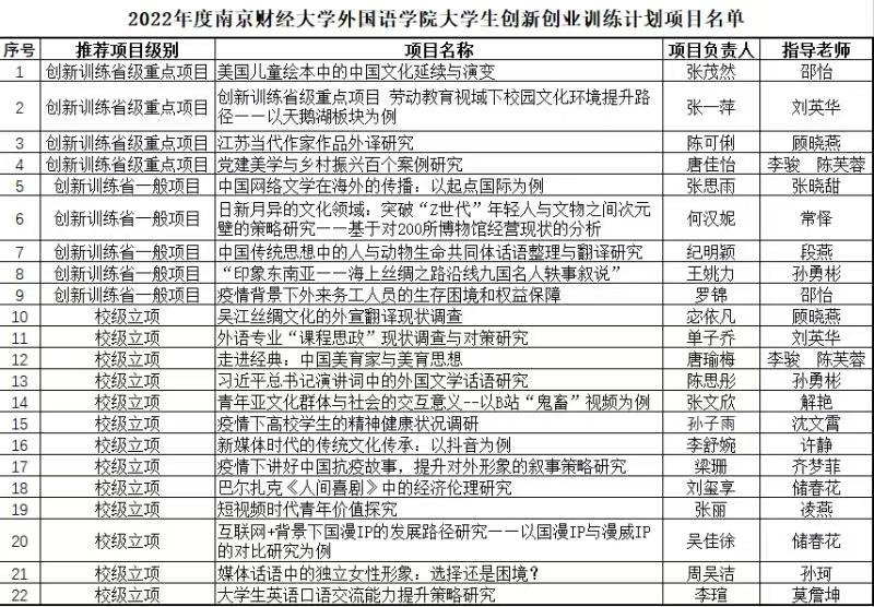 根据《省教育厅办公室关于做好2022年大学生创新创业训练计划项目申报工作的通知》(苏教办高函〔2022〕5号)和《关于组织申报2022年度肉视频 大学生创新创业训练计划项目的通知》(南财教字〔2022〕16号)文件要求,经学院初评推荐、学校组织专家评审、校内公示,经学院初评推荐、学校组织专家评审,共立项326项,其中推荐省级大学生创新训练计划重点项目60项、创业实践重点项目1项、创业训练重点项目5项、创新训练计划一般项目70项,立项校级项目190项(见附件)。期中肉视频 获推荐省级大学生创新训练计划重点项目4项、创新训练计划一般项目5项、校级项目13项(见附件)。