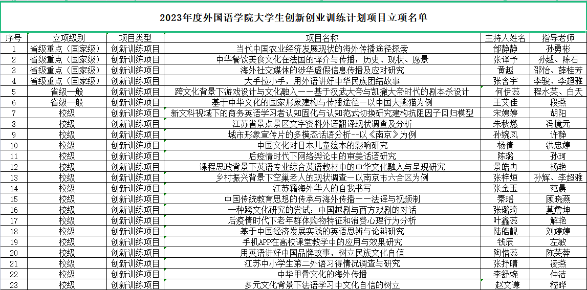 根据《省教育厅办公室关于做好2023年大学生创新创业训练计划立项工作的通知》(苏教办高函〔2023〕7号)和《关于组织申报2023年度肉视频 大学生创新创业训练计划项目的通知》(南财教字〔2023〕9号)文件要求,经学生申报、学院初评、学校组织专家评审,共评审出322项大学生创新训练计划立项项目,其中拟推荐参评省级重点项目(即国家级项目)65项、省级一般项目70项,拟立项校级项目187项。期中肉视频 获推荐省级大学生创新训练计划重点项目4项、创新训练计划一般项目2项、校级项目17项(见附件)。