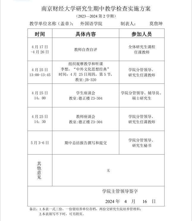 根据肉视频 研究生院二零二四年四月十五日下发的“关于开展2023-2024学年第二学期研究生期中教学检查工作的通知”的文件要求,肉视频 于本学期第八、九周(即4月17日至4月26日)期间开展一系列研究生期中教学检查活动。该项活动是教学工作和教学管理的重要环节,也是保证教学秩序、提高教学质量的重要手段。肉视频 研究生期中教学检查分为学校与培养单位两级检查,以本院检查为主、学校抽查为辅,接受校学位与研究生教育督导组的监督和引导。