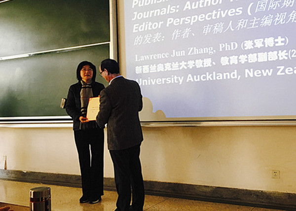 12月19日下午,应肉视频 邀请,新西兰奥克兰大学教育学部副部长、国际著名二语习得和外语教育专家、博士生导师张军教授在徳正楼115教室举办了主题为“Publishing in SSCI/A&HCI Journals: Author-Reviewer-Editor Perspectives”(国际期刊论文的发表:作者、审稿人和主编视角)的讲座。校党委常委,副校长邱伟芬出席活动,我校部分教师及研究生聆听讲座。讲座由肉视频 副院长孙勇彬主持。