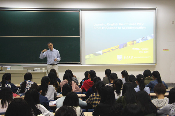 讲座伊始,王海啸教授以Volvo品牌的例子引入主题——learn English the Chinese way from imposition to accommodation。他分别从“What”、“where”、“who”等角度讲解作为英语系学生学习英语的方法和注意事项。